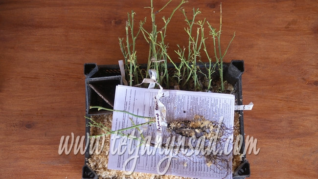 Далі саджанці упаковуються у вологу тирсу. Всі саджанці упаковуються разом, ми не пакуємо кожен окремо, проте кожна рослина має бірку з назвою. Саджанці одного сорту можуть бути зв'язані один з одним однією біркою.