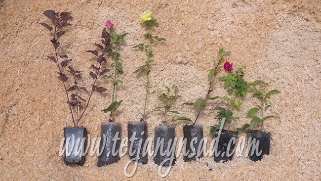 Саджанці окремо. Зліва-направо: пухироплідник, дві троянди, гортензія, гумі, троянда, актинидія.