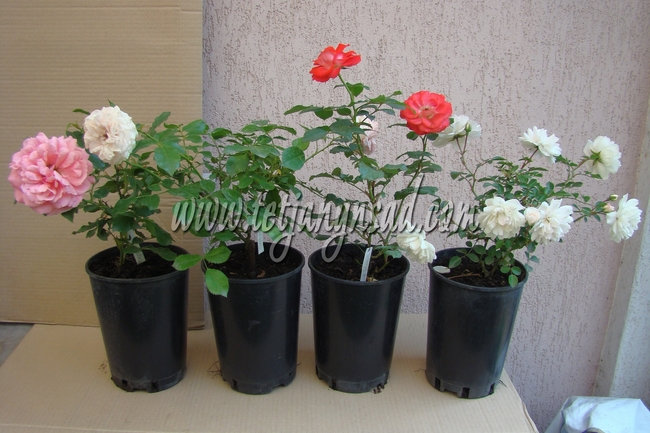 Пройшов один рік. На фото ті самі саджанці троянд, які Ви бачили на попередніх фото, пересаджені в більші горщики. І ми впевнені, що, будучи висадженими у відкритий грунт на Вашій присадибній ділянці, вони розрослися і зміцніли за цей рік набагато сильніше.