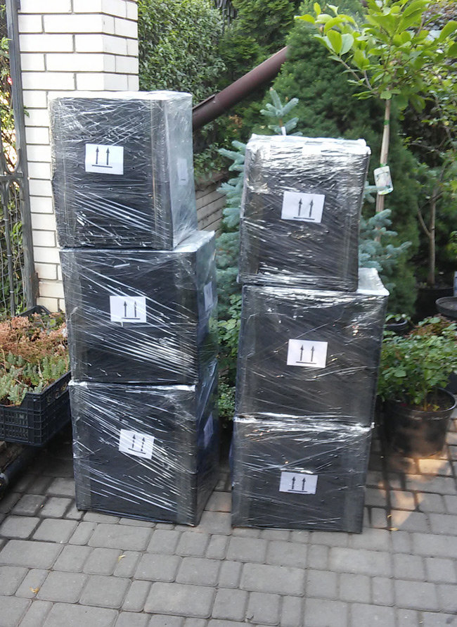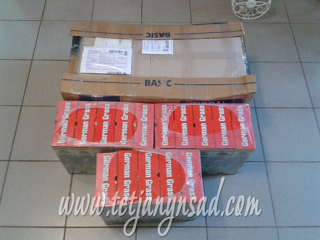 Однак бувають і більш об'ємні замовлення. На фото коробка з саджанцями розміром 50х50х120 + 15 кг газонної трави.